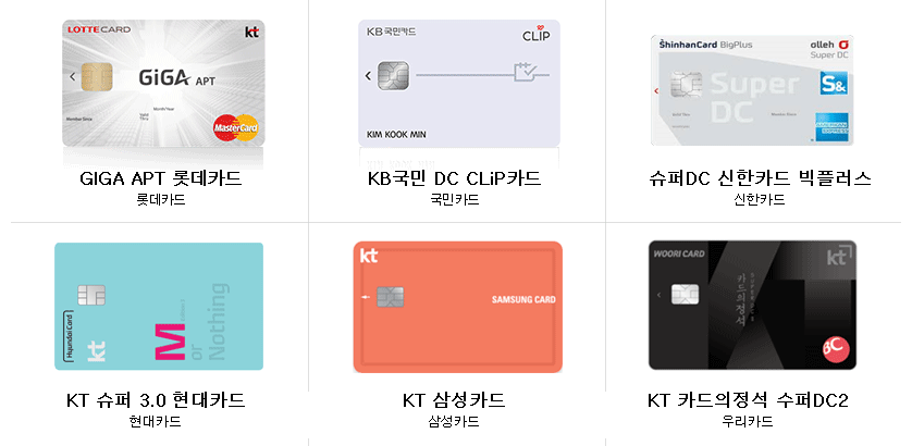 올레KT 제휴카드를 이용하시면 카드사 혜택에 맞게 매월 통신요금을 추가로 할인 받을 수 있습니다.